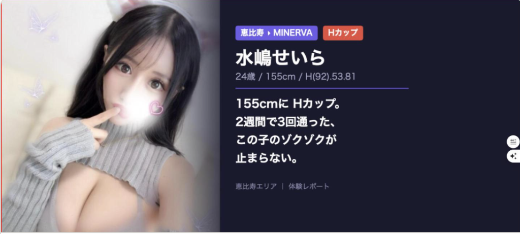 (4/26.28.30.5/3出勤)155cmに Hカップ。2週間で3回通った、この子のゾクゾクが止まらない。MINERVA(ミネルバ) 水嶋せいら 体験談