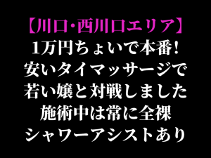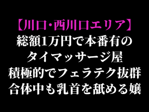 【川口・西川口エリア】総額1万円で本番有のタイマッサージ屋 積極的でフェラテク抜群、合体中も乳首を舐める嬢