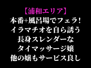 【浦和エリア】本番+風呂場でフェラ! イラマチオを自ら誘う長身スレンダーなタイマッサージ嬢、他の嬢もサービス良し