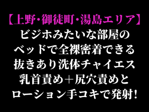4/30まで半額セール中!【上野・御徒町・湯島エリア】ビジホみたいな部屋のベッドで全裸密着できる抜きあり洗体チャイエス 乳首責め+尻穴責めとローション手コキで発射!
