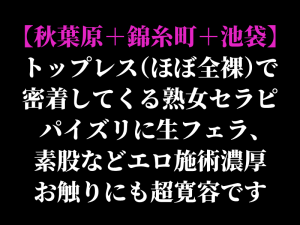 新規記事!【秋葉原+錦糸町+池袋】トップレス(ほぼ全裸)で密着してくる熟女セラピ パイズリに生フェラ、素股などエロ施術濃厚、お触りにも超寛容です